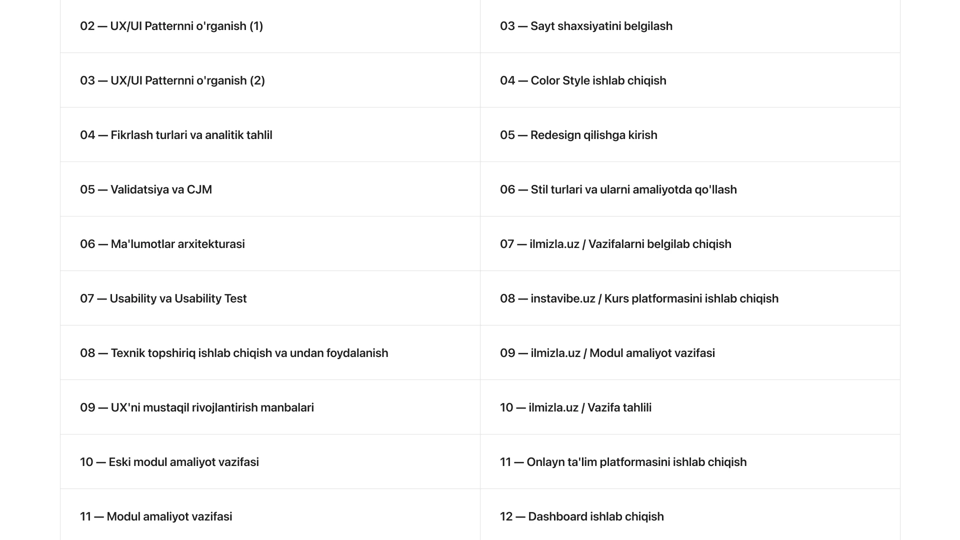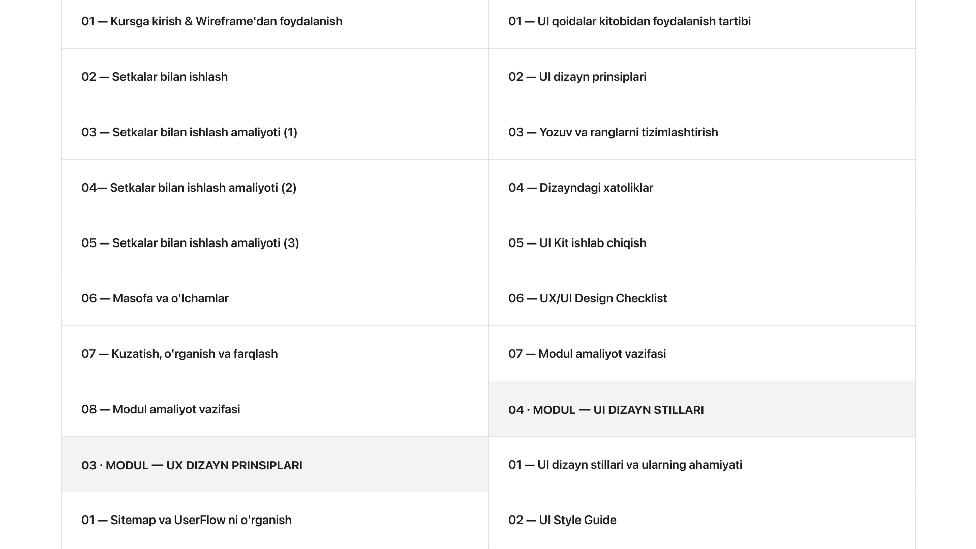 Videokurs 5 ta moduldan iborat. UX/UI bo'yicha amaliyotga asoslangan eng muhim mavzularni to'liq qamrab olgan kurs.