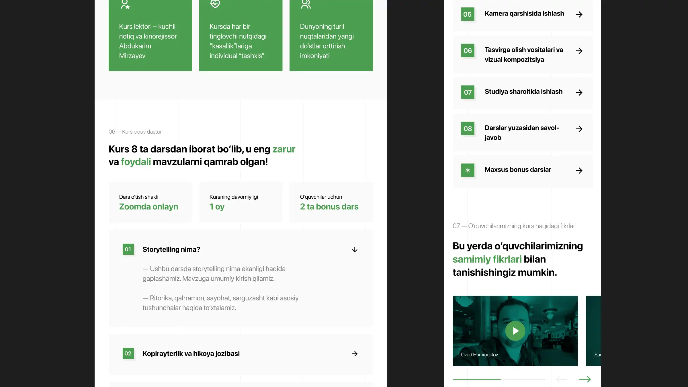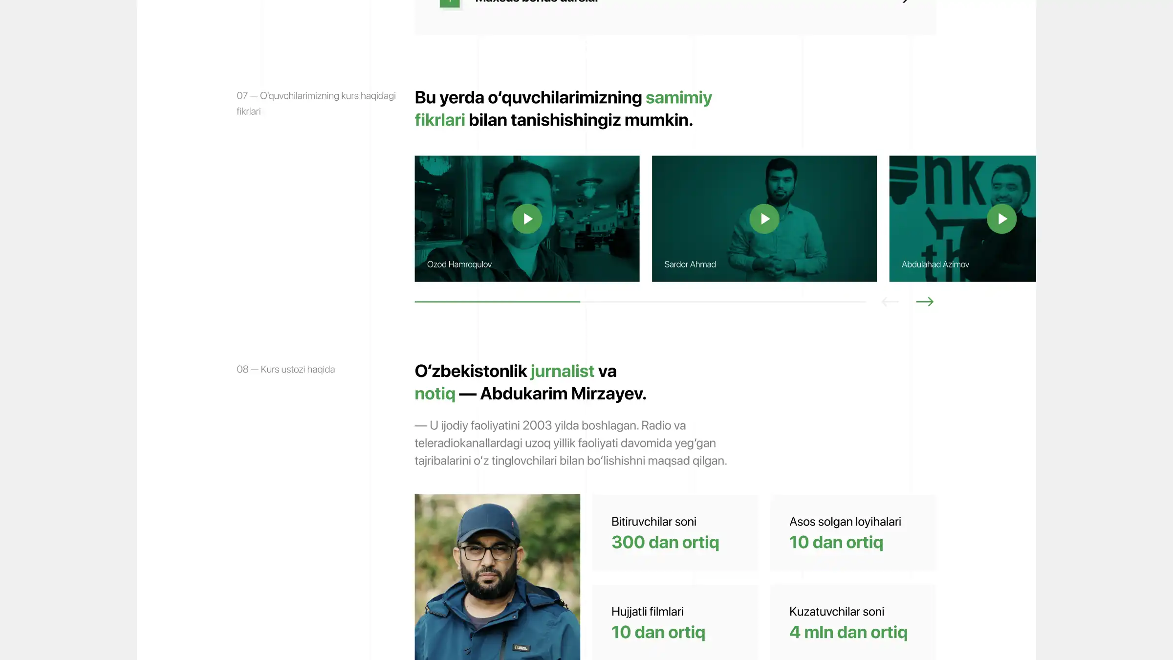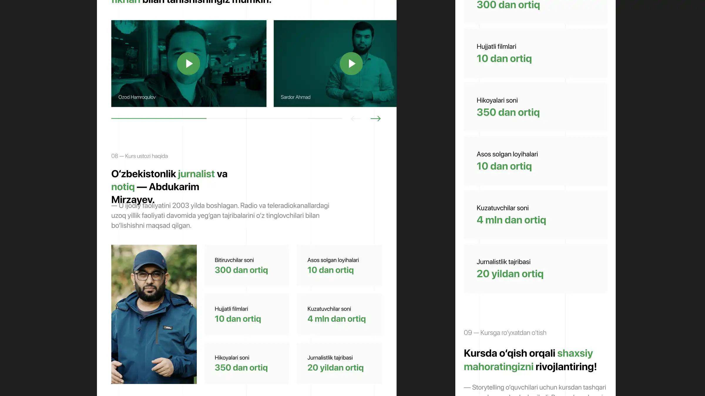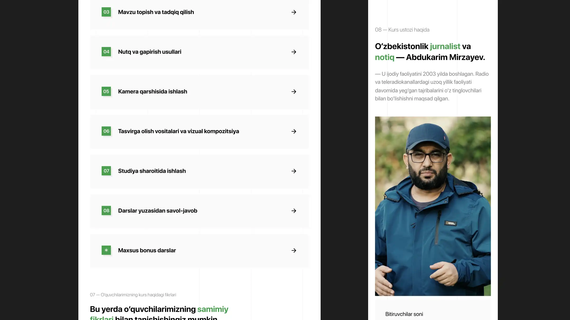 Taniqli jurnalist va rejissyor Abdukarim Mirzayevning mualliflik kursi uchun maxsus ishlab chiqilgan, yuqori estetik qiymatga ega promo-sayt.