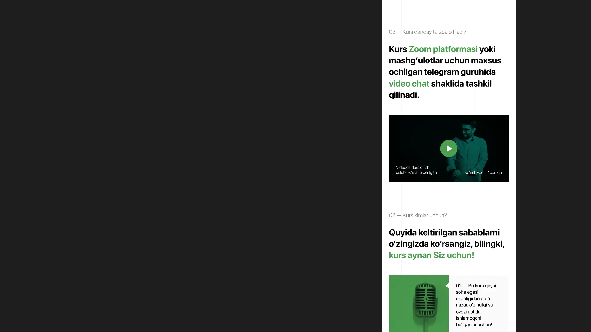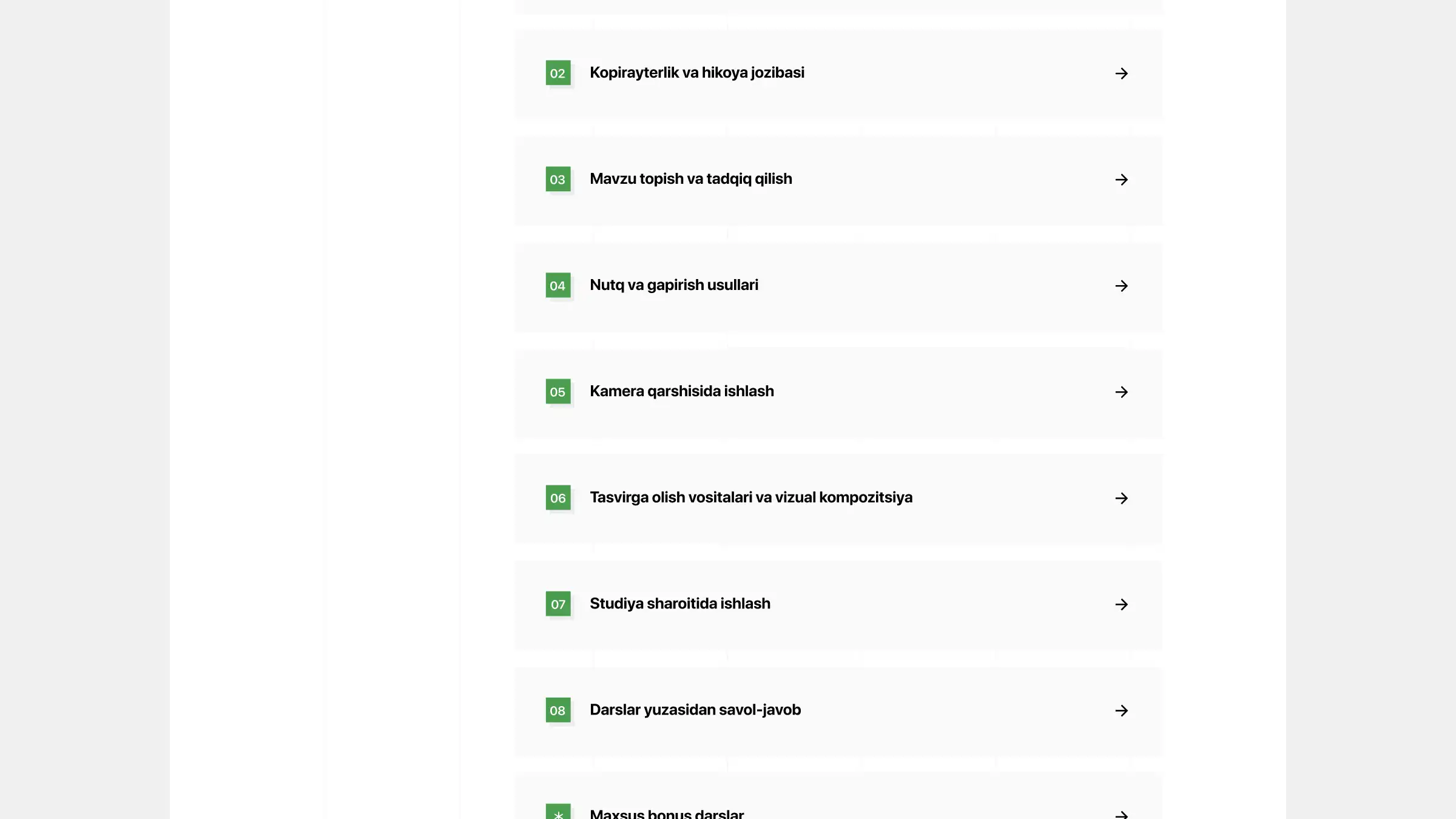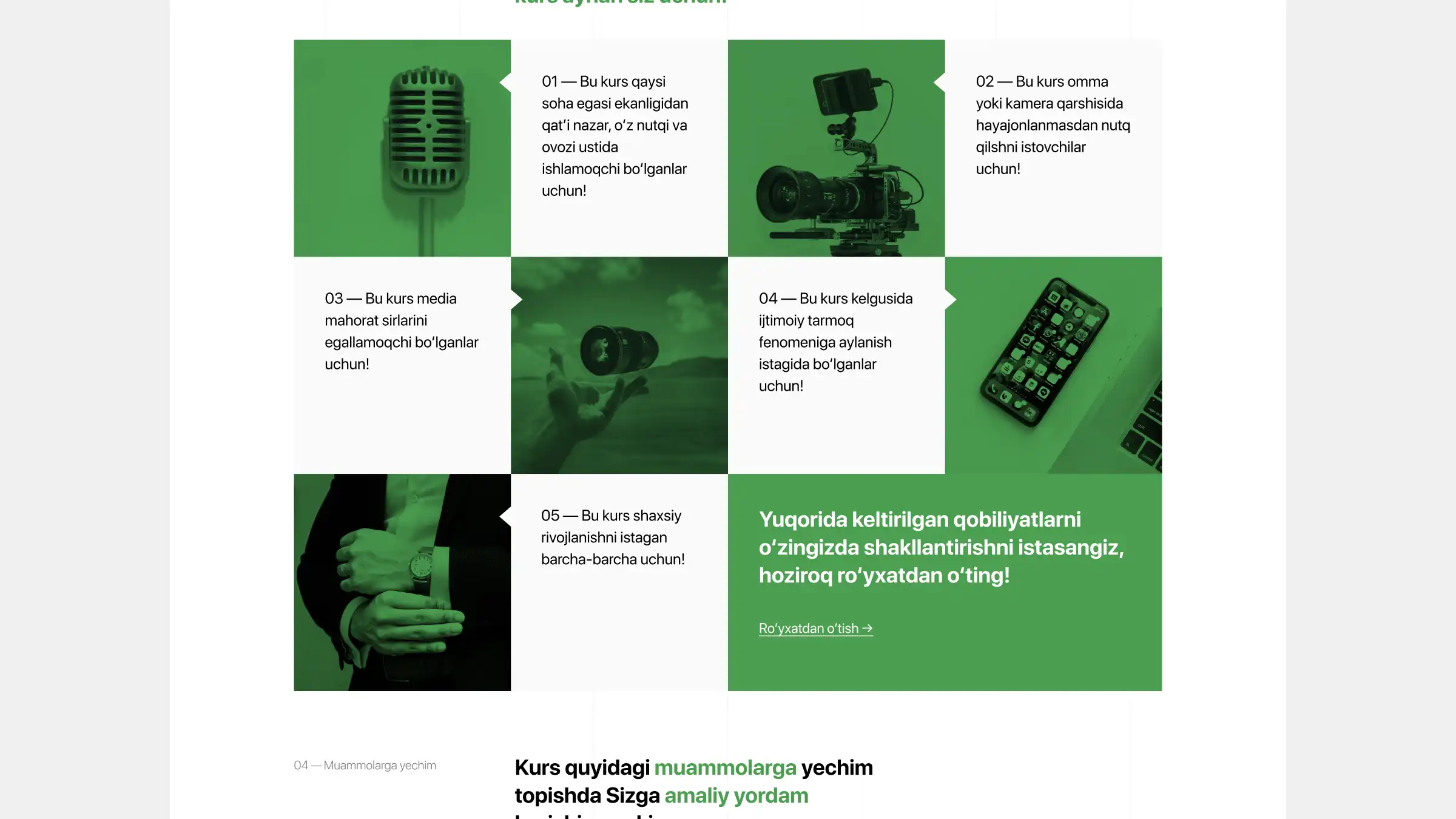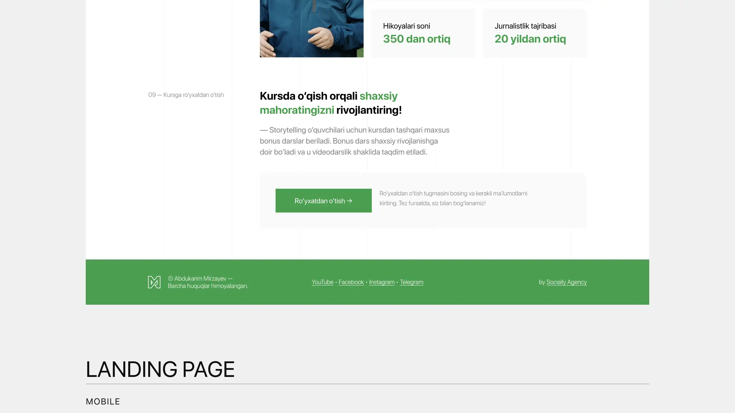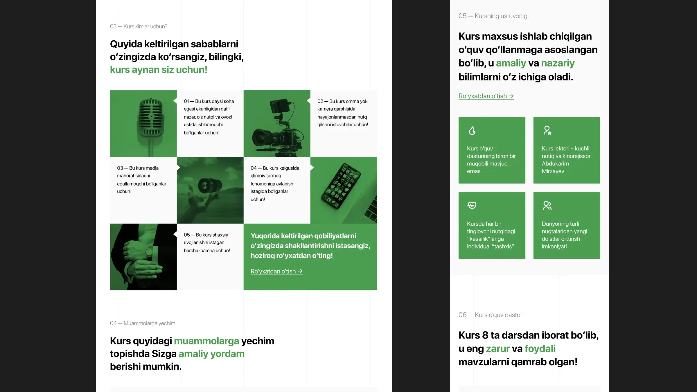 Taniqli jurnalist va rejissyor Abdukarim Mirzayevning mualliflik kursi uchun maxsus ishlab chiqilgan, yuqori estetik qiymatga ega promo-sayt.