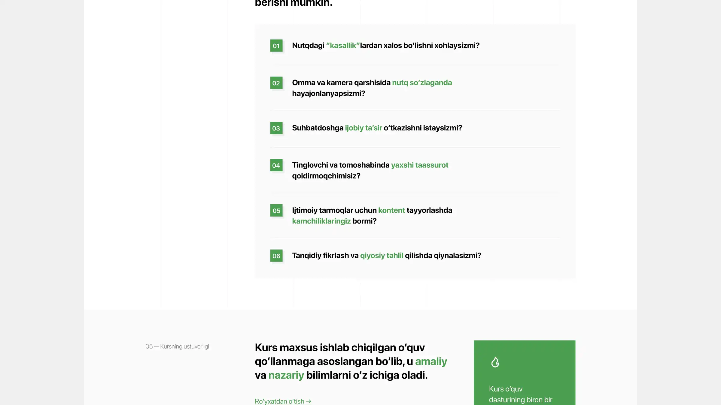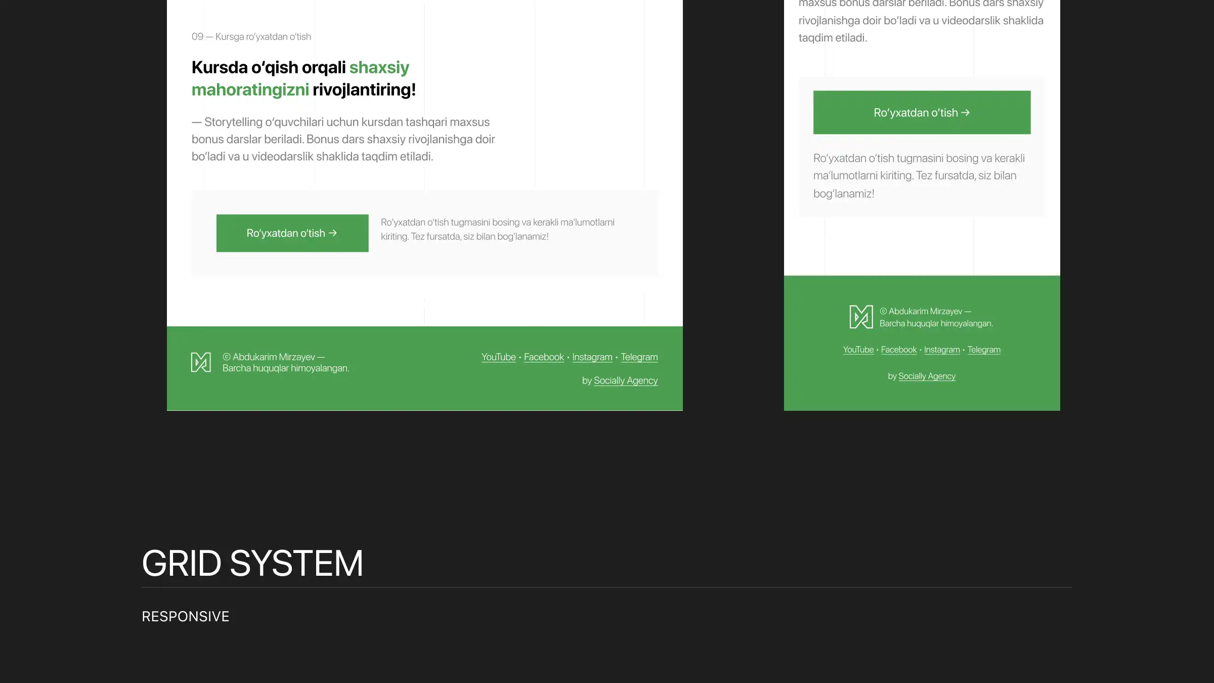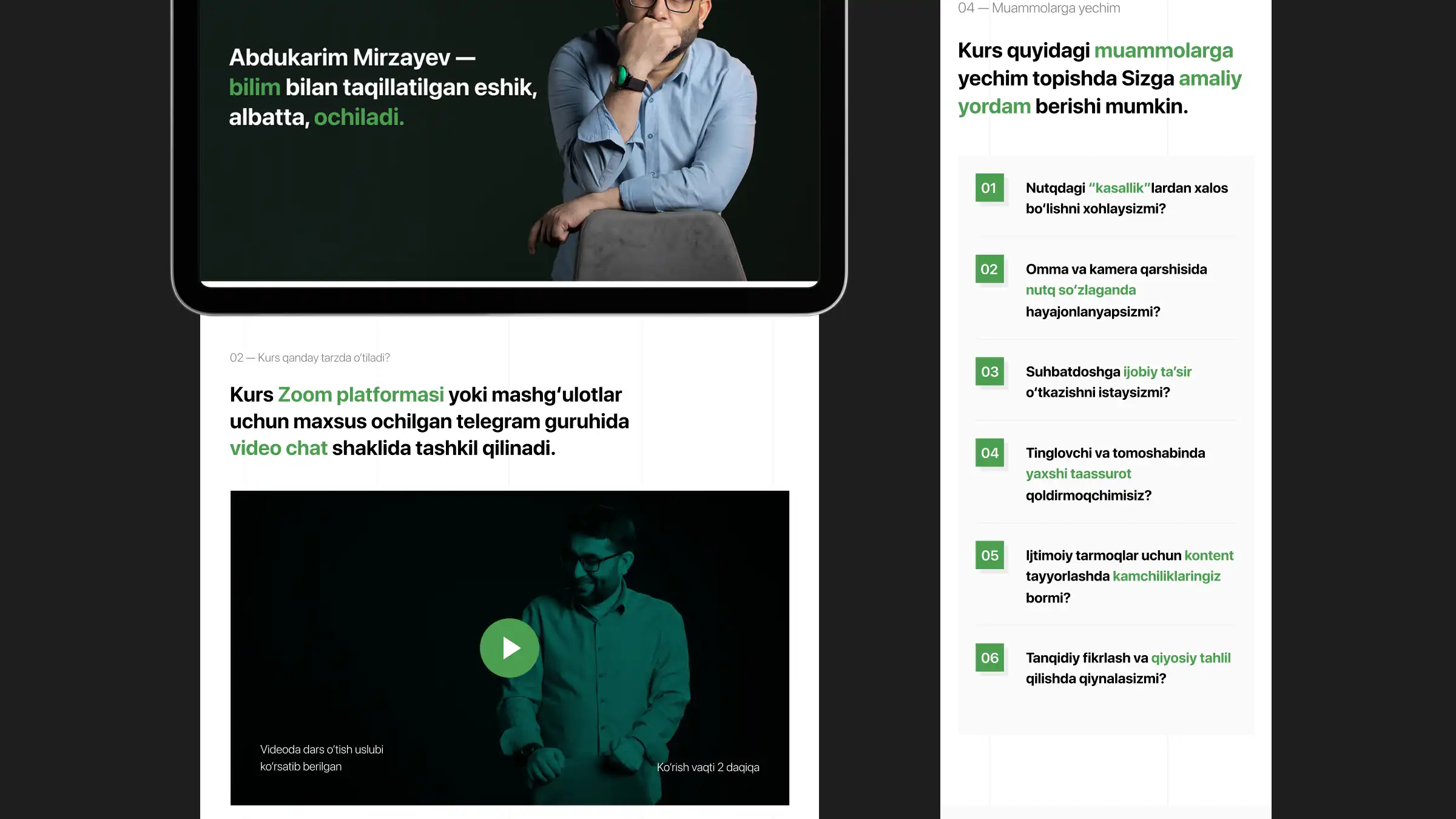 Tipografiya va vizual kontent uyg'unligiga asoslangan, "atmosferali" dizayn yaratildi. Sayt tashrif buyuruvchilarni muallif dunyoqarashi bilan yaqindan tanishtirib, kursga bo'lgan qiziqishni keskin oshirdi.