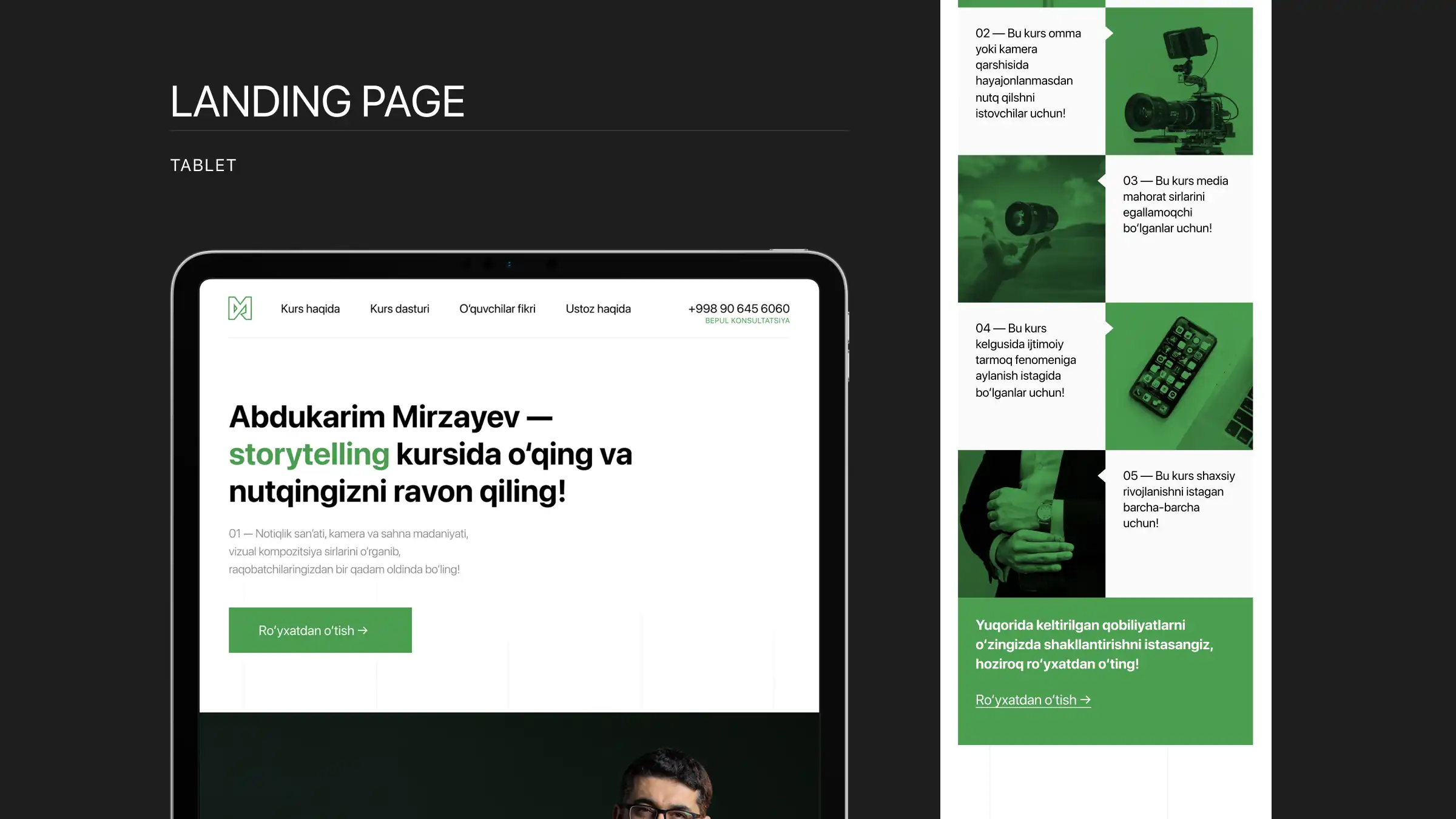 Kursning mazmun-mohiyatini vizual hikoya (visual storytelling) orqali yetkazib berish, foydalanuvchilarda hissiy bog'liqlik yaratish va ro'yxatdan o'tish jarayonini shakllantirish.