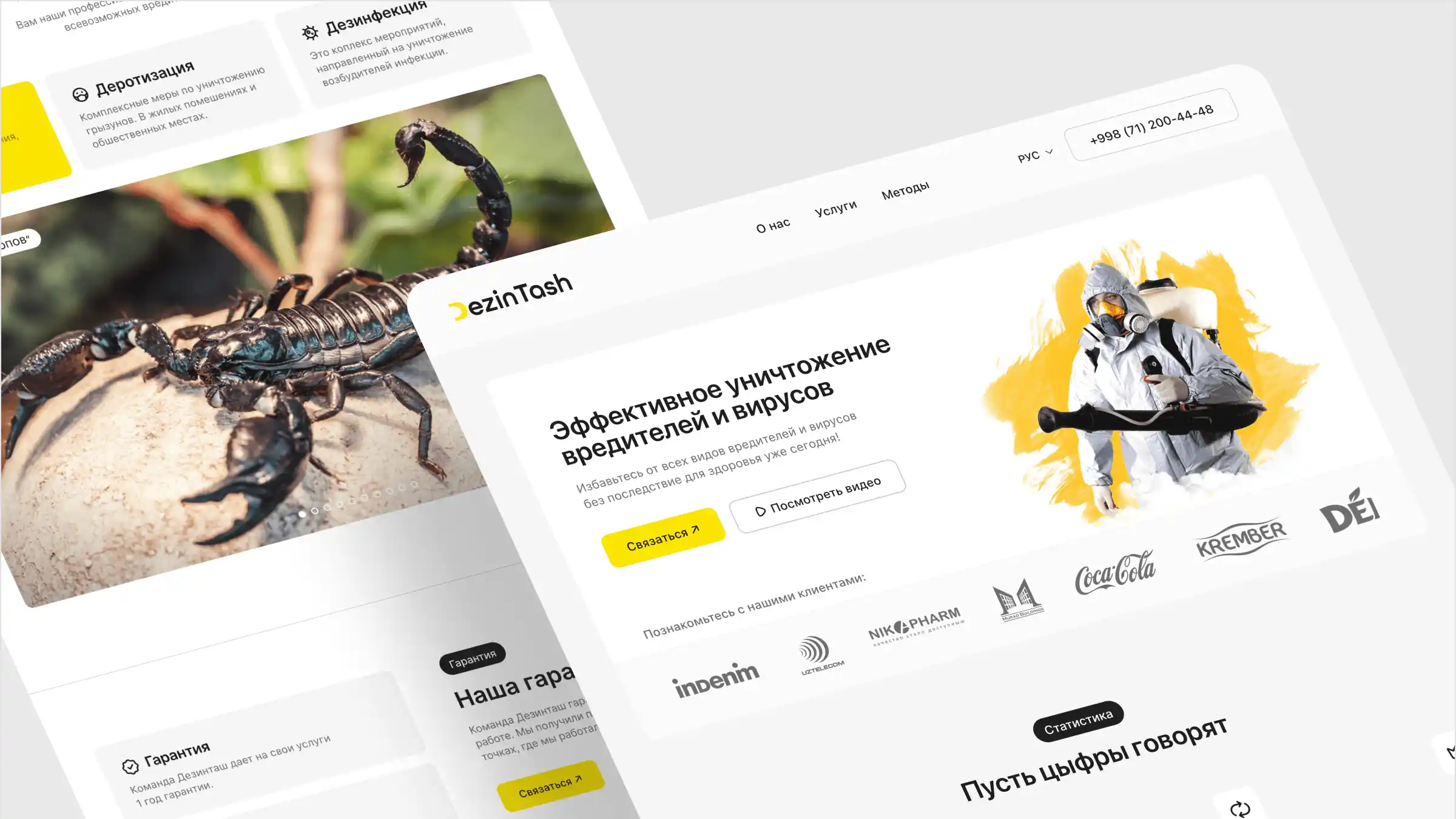 Dezintash — professional dezinfeksiya xizmatlarini ko'rsatuvchi ishonchli kompaniya. Biz ushbu brend uchun mijozlarga tezkor yordam olish imkonini beruvchi va xizmatlar sifatini kafolatlovchi korporativ veb-sayt yaratdik.