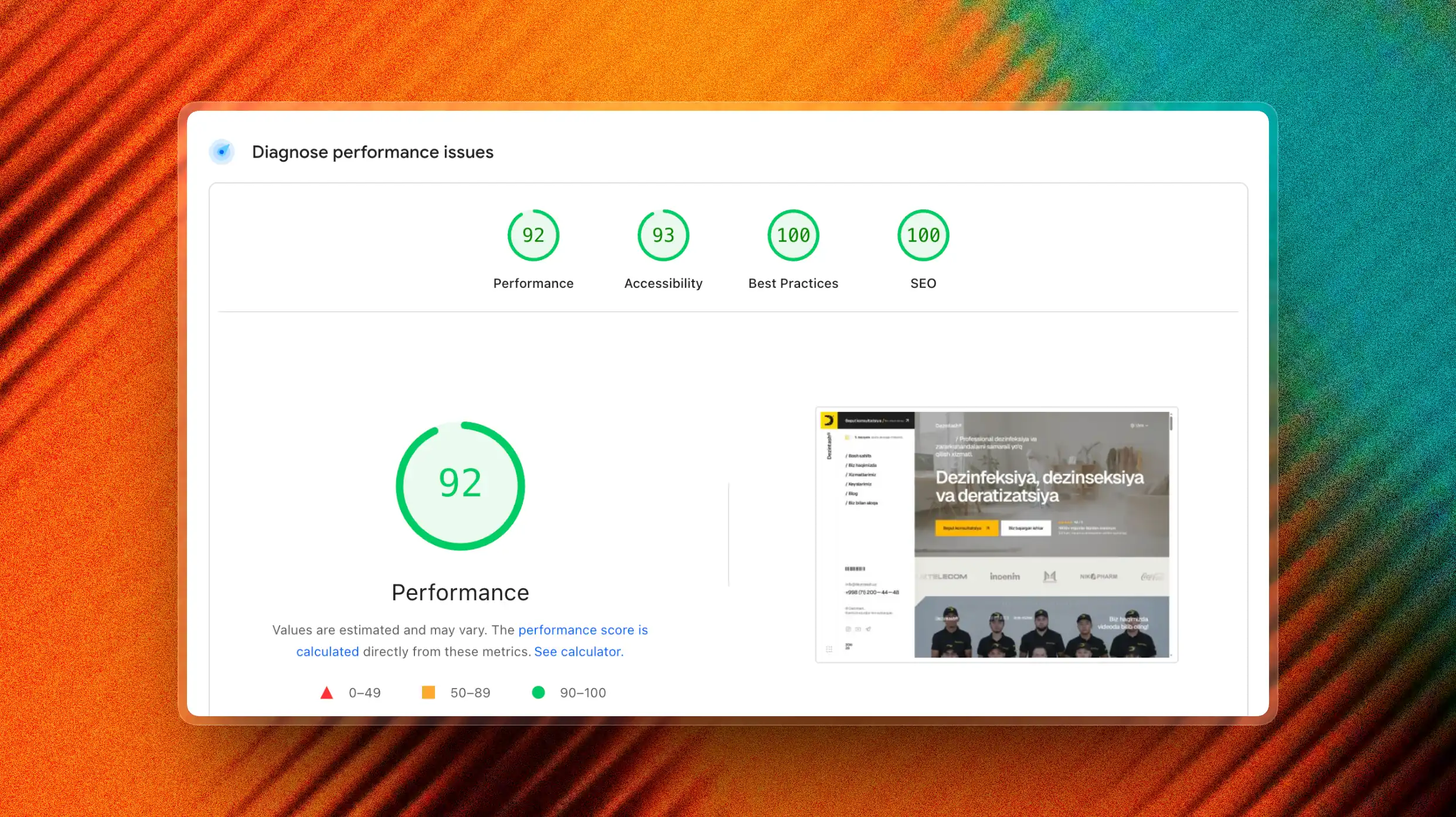 Tezkorlik va SEO: Sayt yuklanish tezligi optimallashtirildi va qidiruv tizimlari (Google, Yandex) talablariga mos ravishda birlamchi SEO sozlamalari amalga oshirildi.